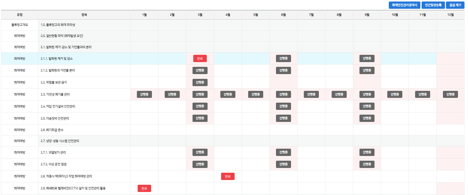 관리항목별로 점검 기간 내에 관리항목에 대한 체크리스트와 조치수행 내용을 체크 및 작성하면, 그결과를 물류창고업 「화재안전 관리계획서」 의 결과물로 보관 및 출력